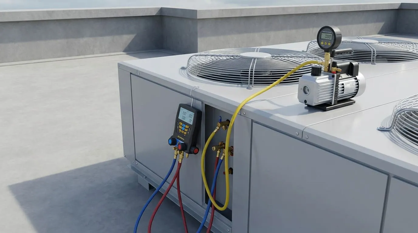 вакуумирование (контроль по микрон-метру), проверка герметичности, заправка по массе/суперподогреву