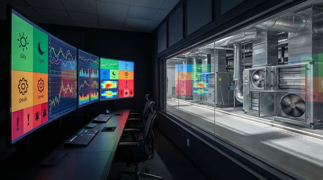 Измерения и выравнивание по зонам, калибровка датчиков, уставки/приоритеты, тренды и тревоги в BMS/SCADA.