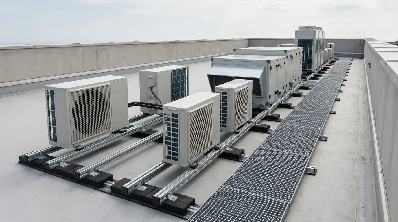 внутренние/наружные блоки, руфтопы, ПВУ, венткамеры — с соблюдением нагрузок и сервисных зон