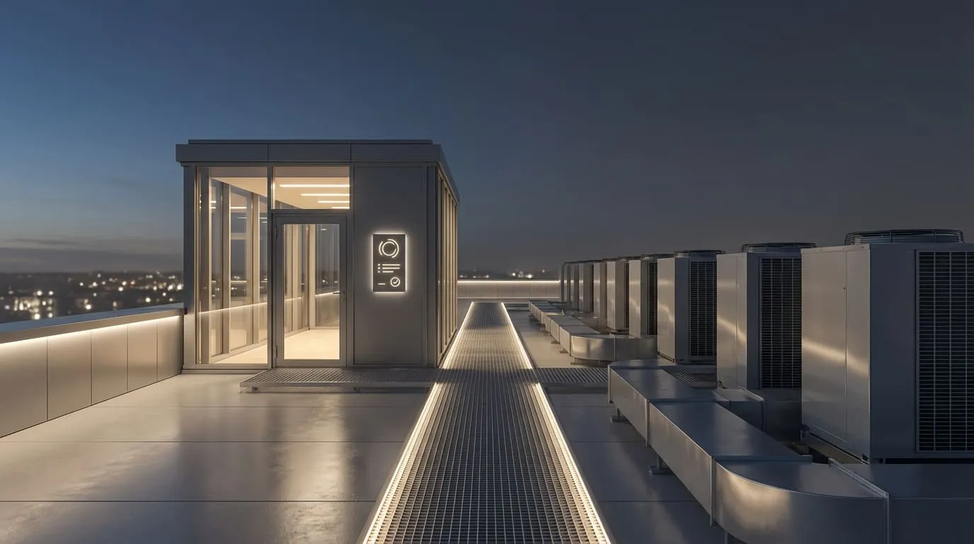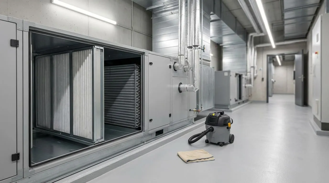 чистка теплообменников/фильтров, проверка дренажа, ремни/крепёж, смазка, контроль токов/вибраций/температур